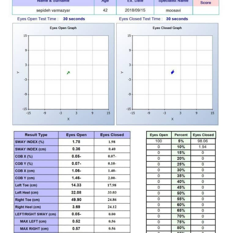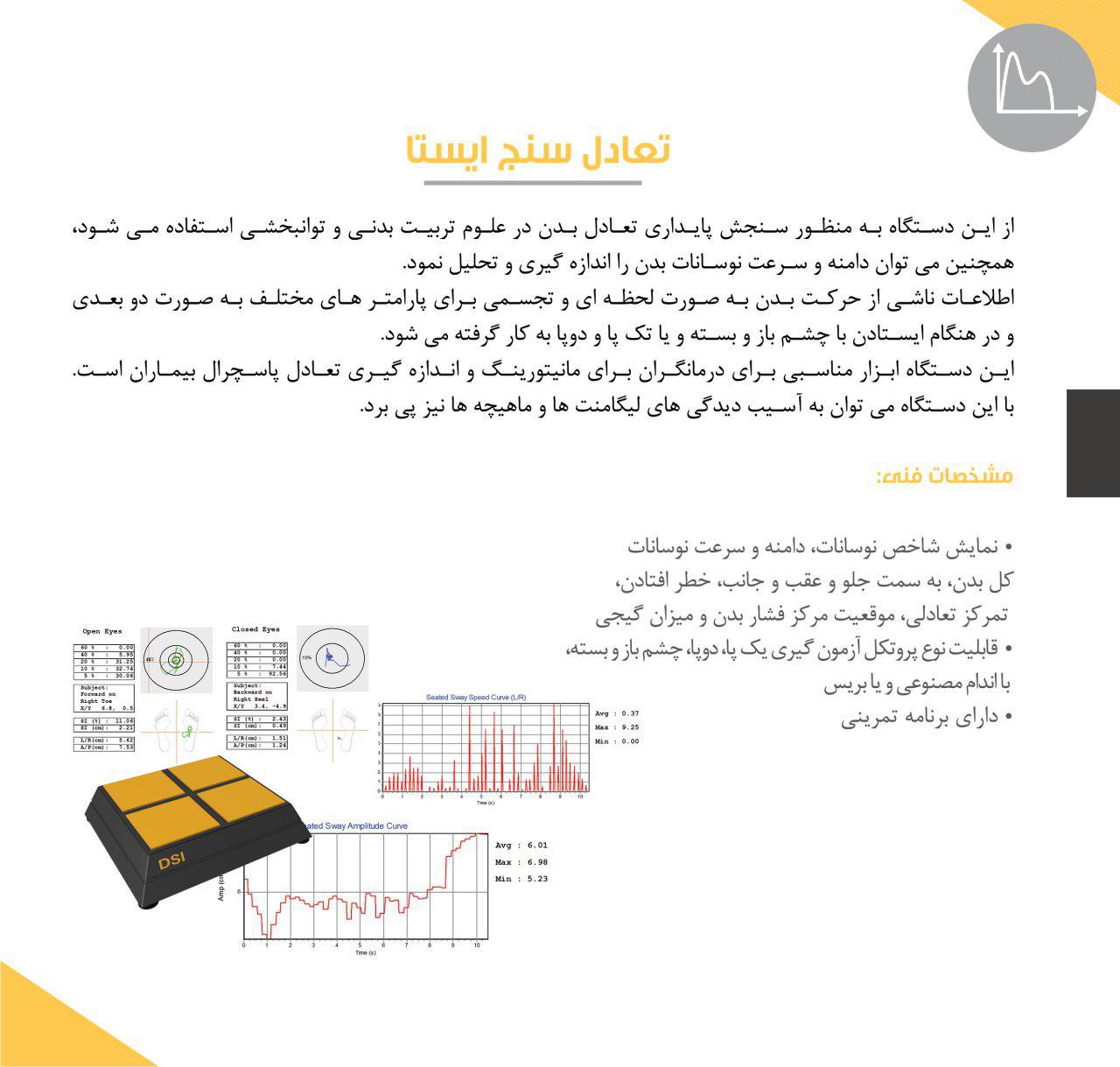 • قابلیتها: اندازهگیری نوسانات تعادلی بدن و خطر افتادن، ترسیم مرکز فشار بدن در واحد زمان، محاسبه تمرکز تعادلی